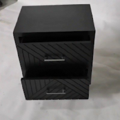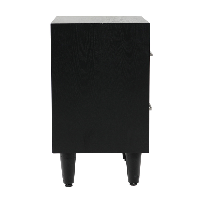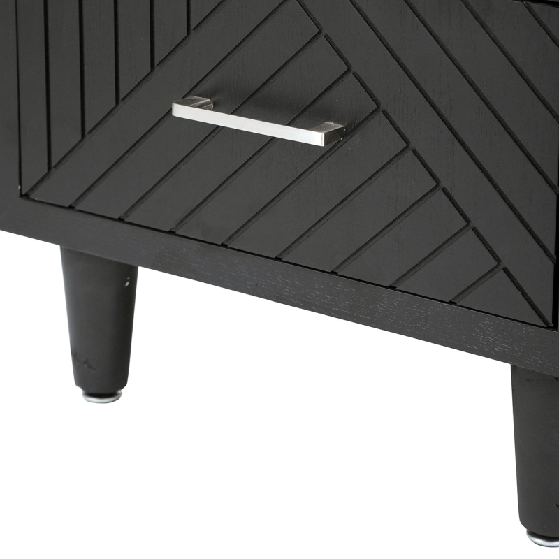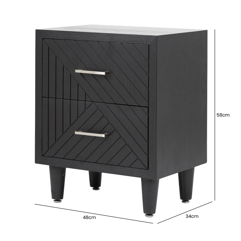 The Solano 2-drawer bedside cabinet exudes sleek and contemporary elegance. Featuring a chic chevron pattern in black wood with chrome bar handles on the two ample drawers, this piece would make a stunning addition to any bedroom. This versatile piece would also work well as a stylish end table/small storage unit