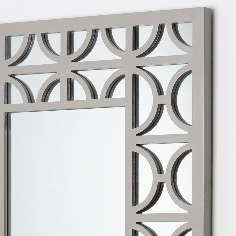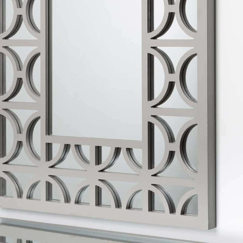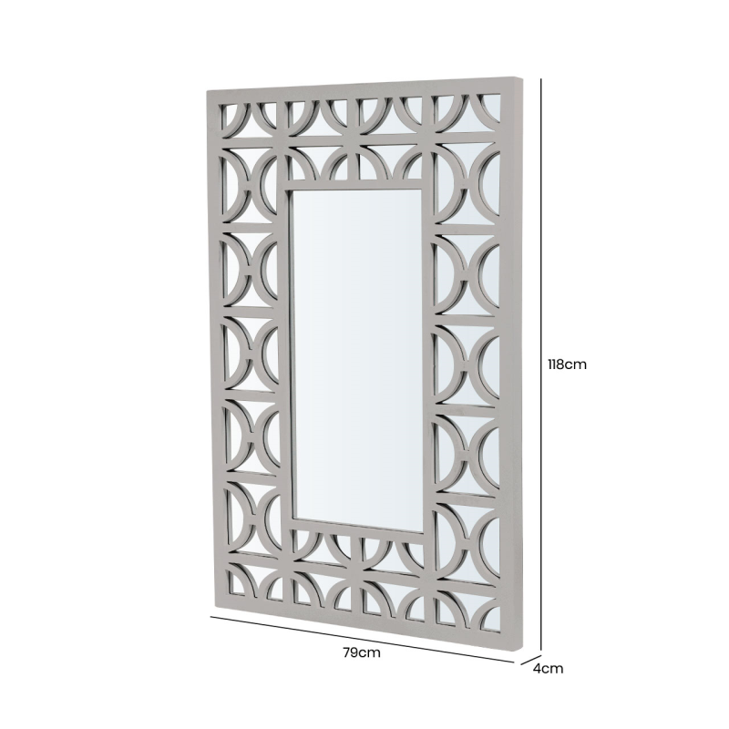 With the Torino grey wood rectangular wall mirror, you can create a beautiful and chic wall display. The mirror has an elegant geometric circle design wooden frame.