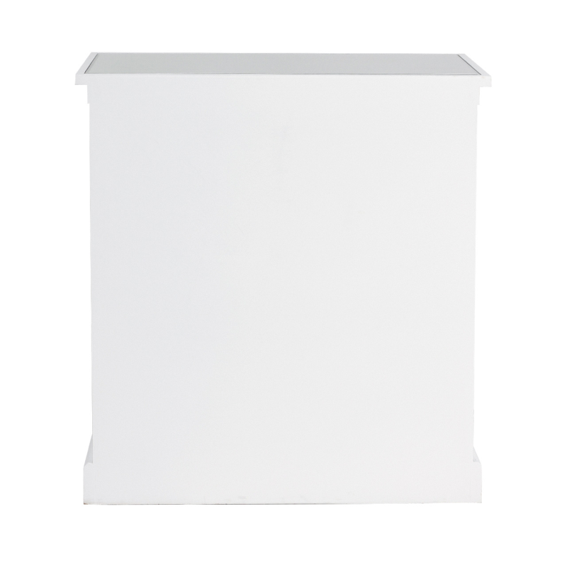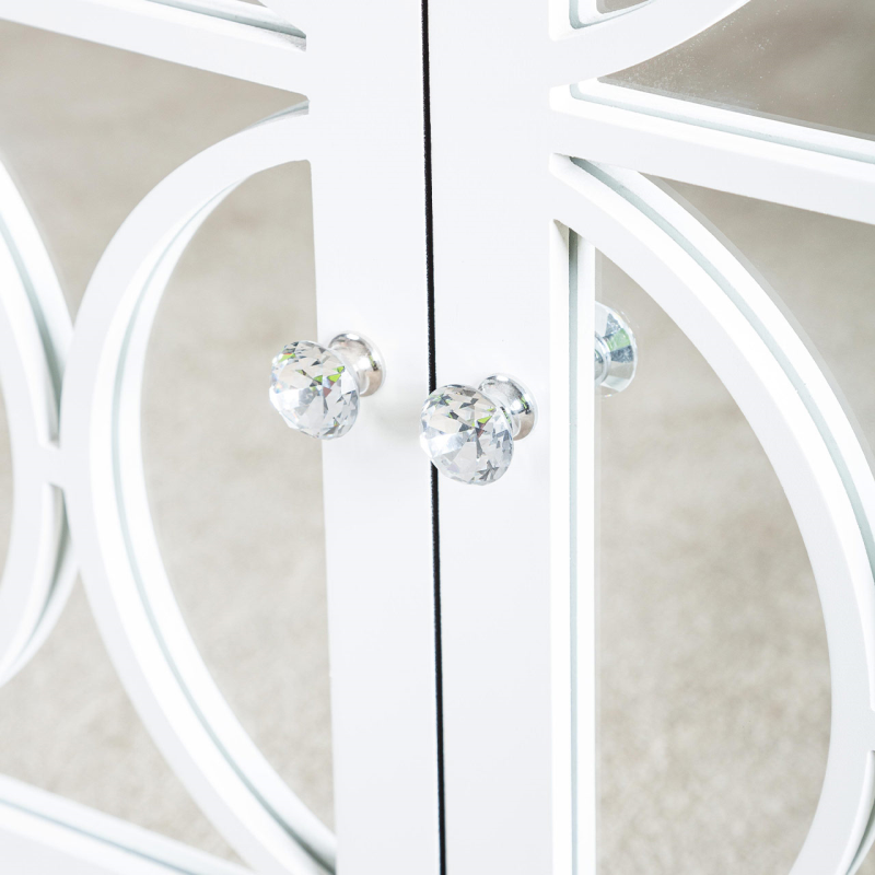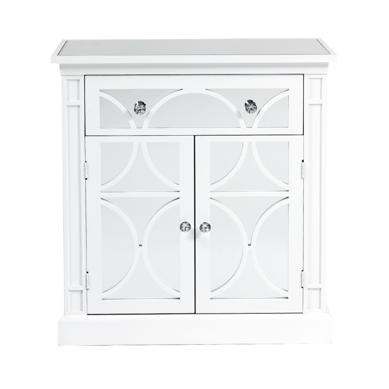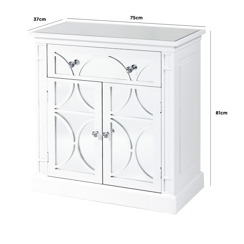 Our Torino white wood 2 door 1 drawer sideboard is a beautiful blend of modern and traditional that will enhance the overall aesthetic of your living space. The mirrored doors and drawers are overlaid with white gloss wood effect geometric circular panels and have exquisite crystal handles. This compact sideboard will add storage and is ideal for smaller living spaces