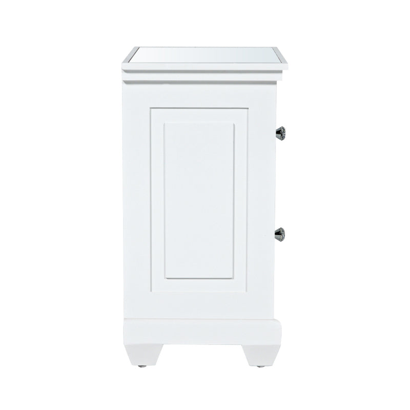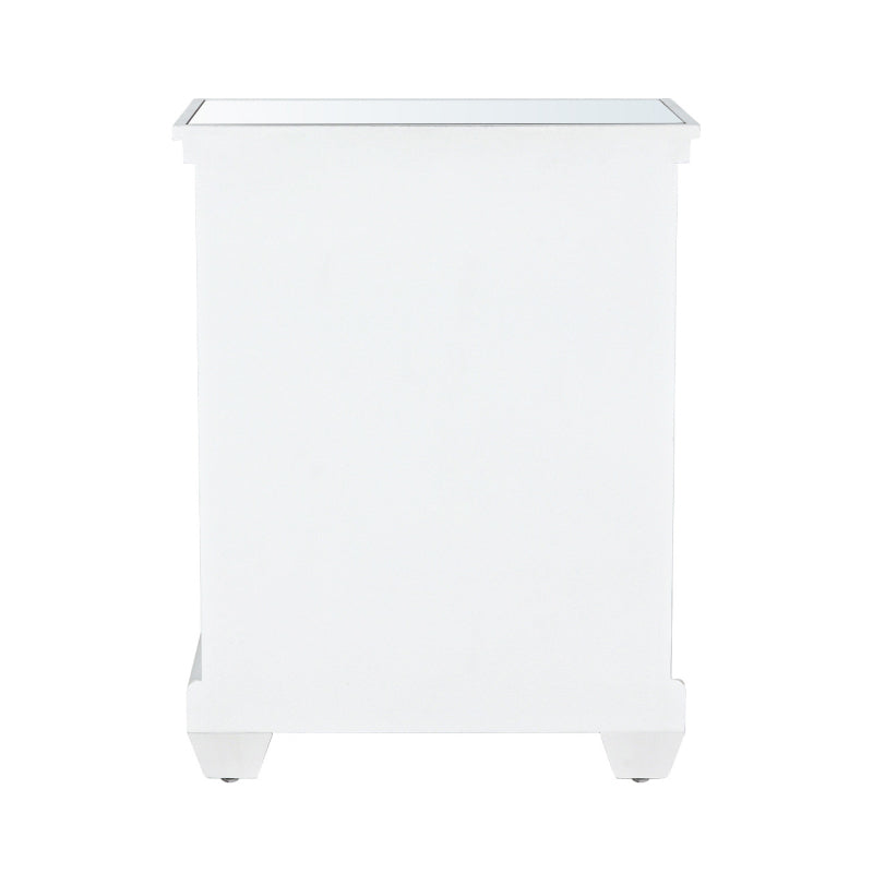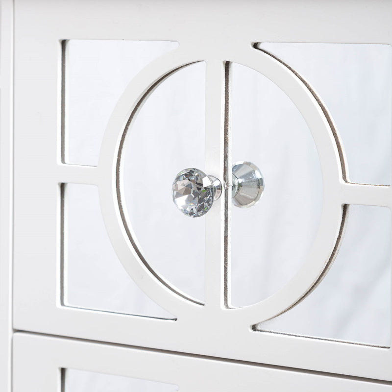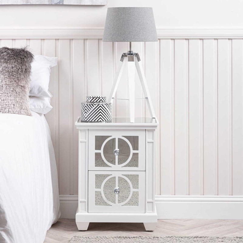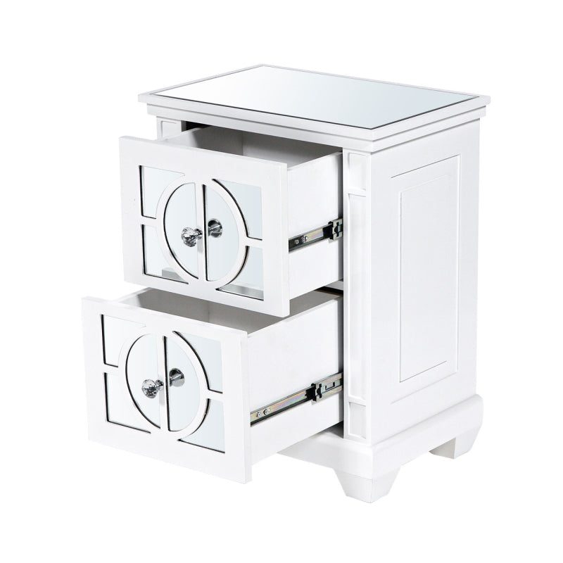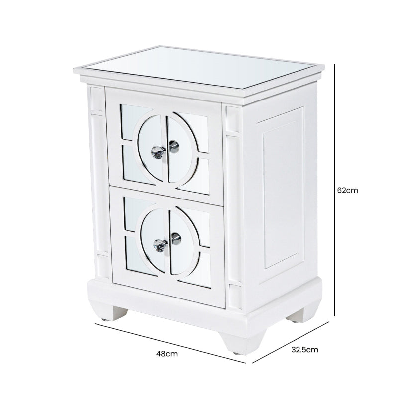 Our Torino white wood 2-drawer bedside is a beautiful blend of modern and traditional that will enhance the overall aesthetic of your living space. The mirrored doors are overlaid with white gloss wood effect geometric circular panels and have exquisite crystal handles. This elegant piece would work equally well as an end table, occasional, or display table.
