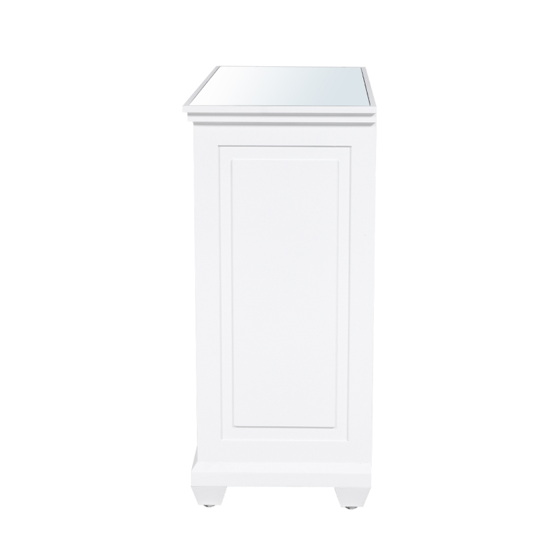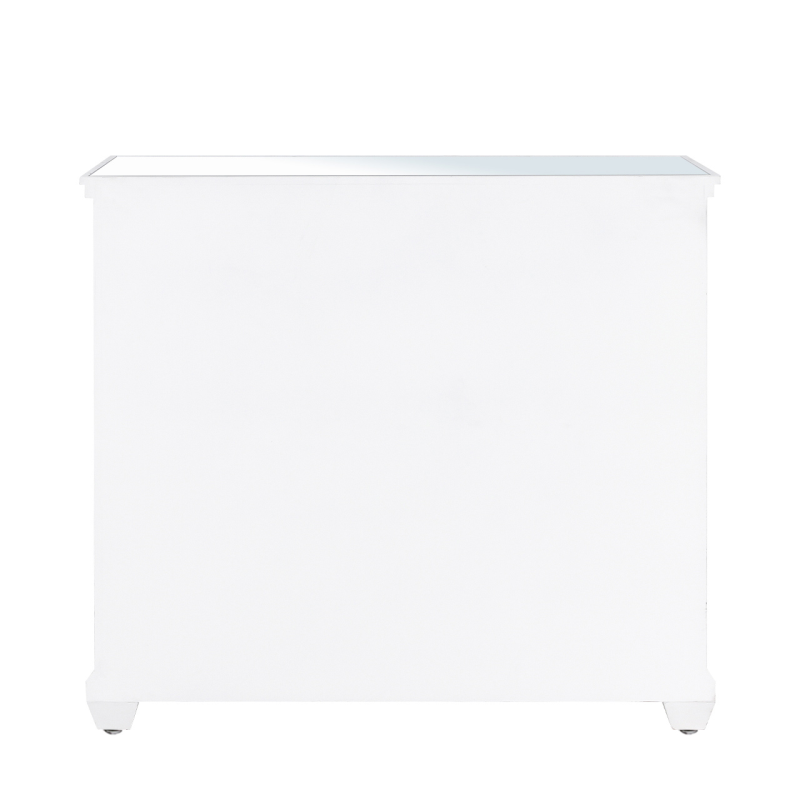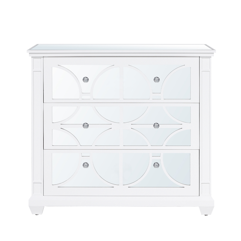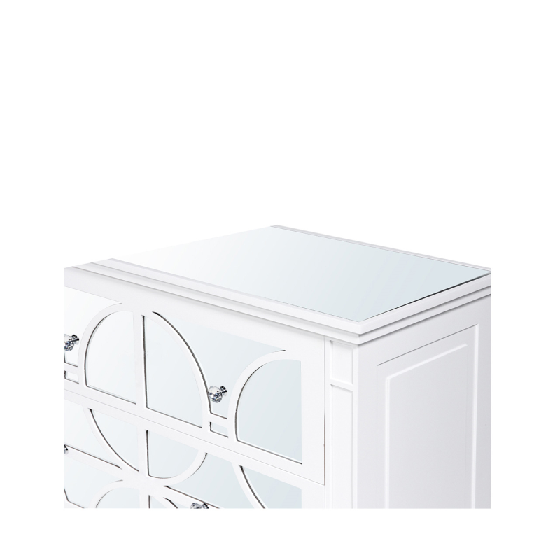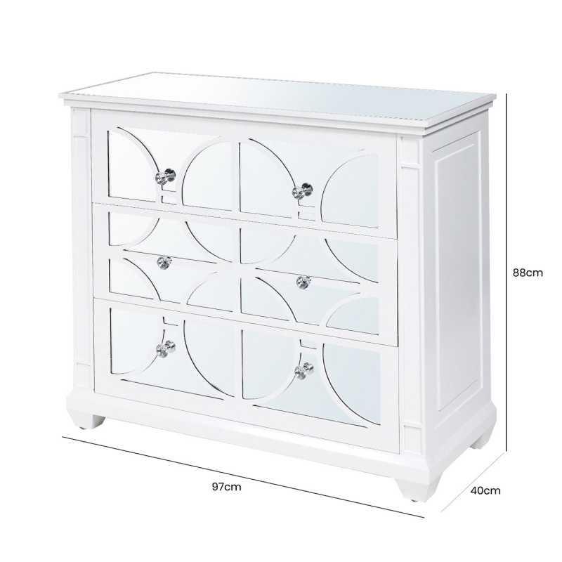 Our Torino white wood 3 drawer chest is a beautiful blend of modern and traditional that will enhance the overall aesthetic of your living space. The mirrored drawers are overlaid with white gloss wood effect geometric circular panels and have exquisite crystal handles.