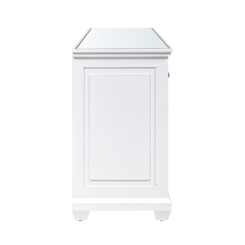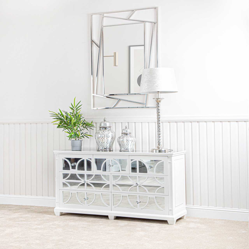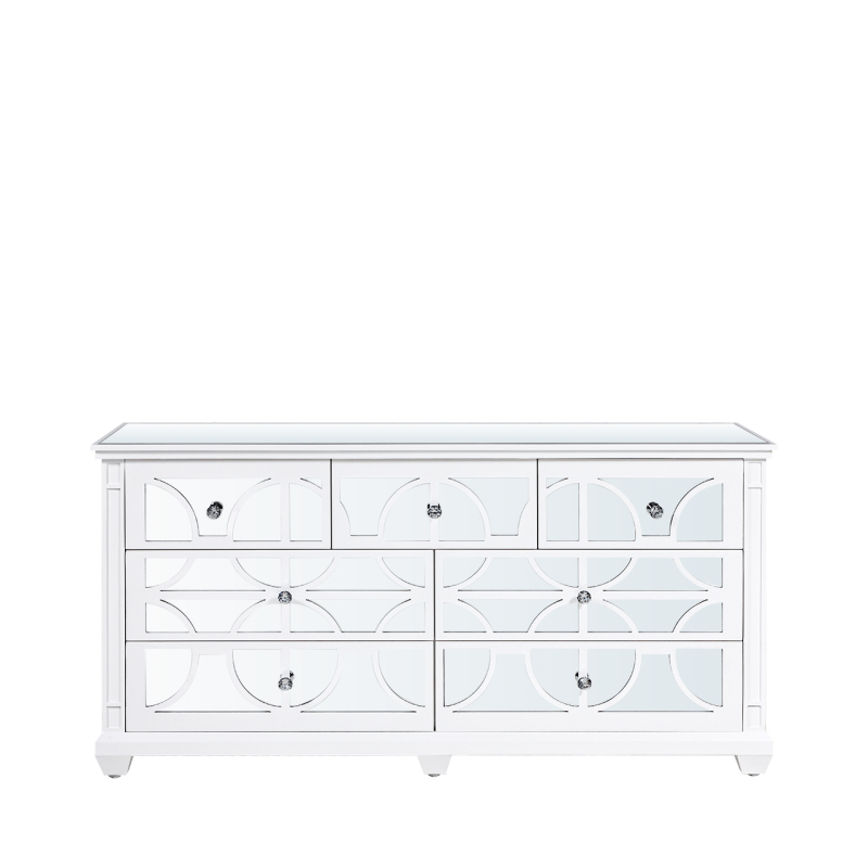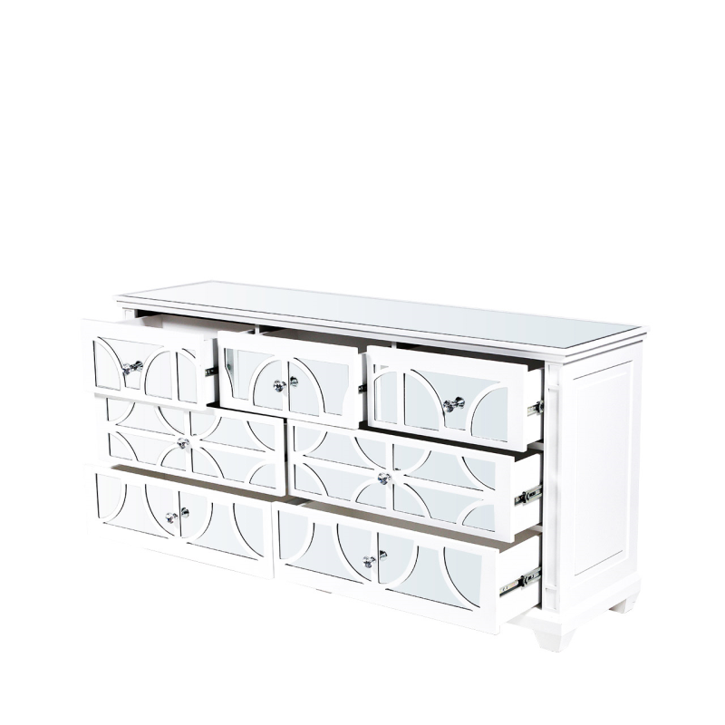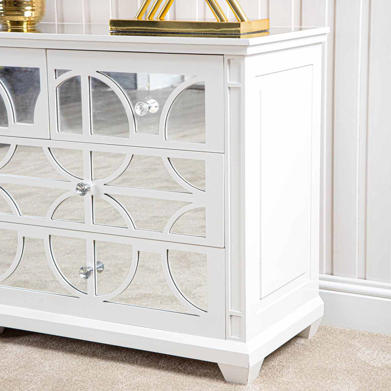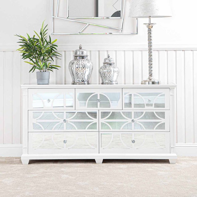 Our Torino white wood 7 drawer chest is a beautiful blend of modern and traditional that will enhance the overall aesthetic of your living space. The mirrored drawers are overlaid with white gloss wood effect geometric circular panels and have exquisite crystal handles and provide generous storage space.