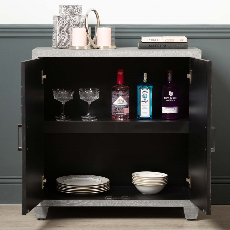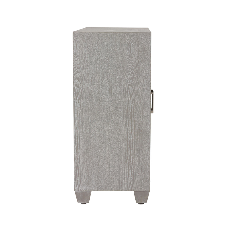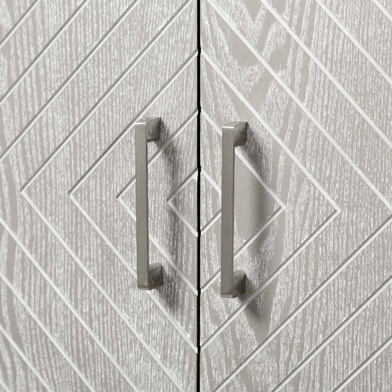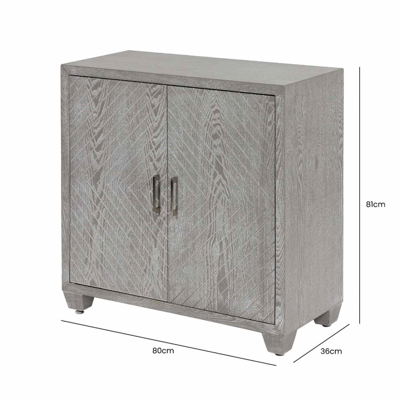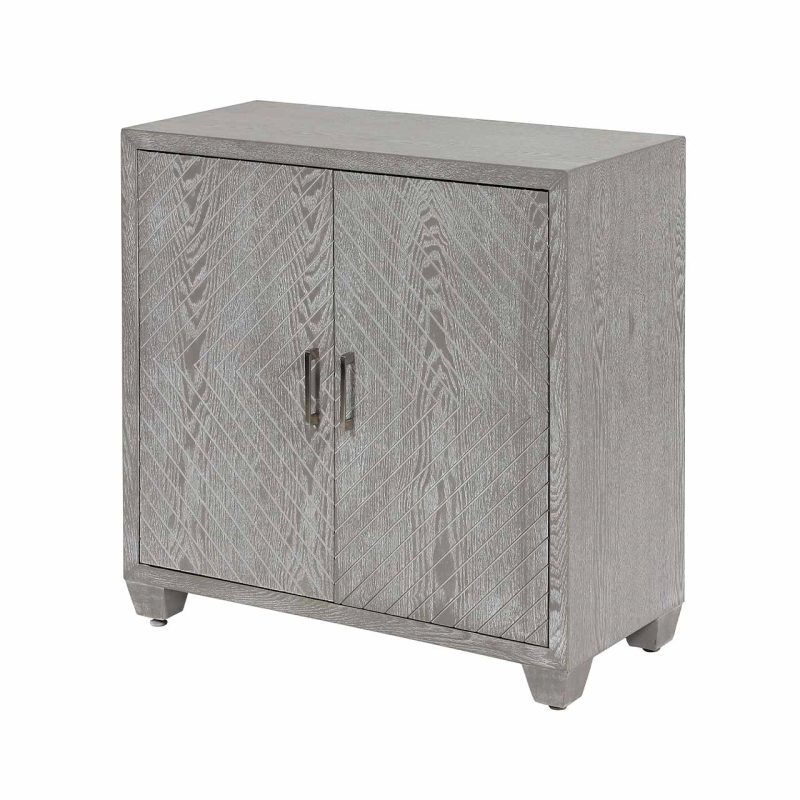 Our simple yet stylish Venus two-door cabinet is designed to complement any decor. The muted grey-washed elm grain finish with chevron detailing, sleek satin steel bar handles on the drawer fronts, and elegant turned legs make this tasteful, versatile and functional.