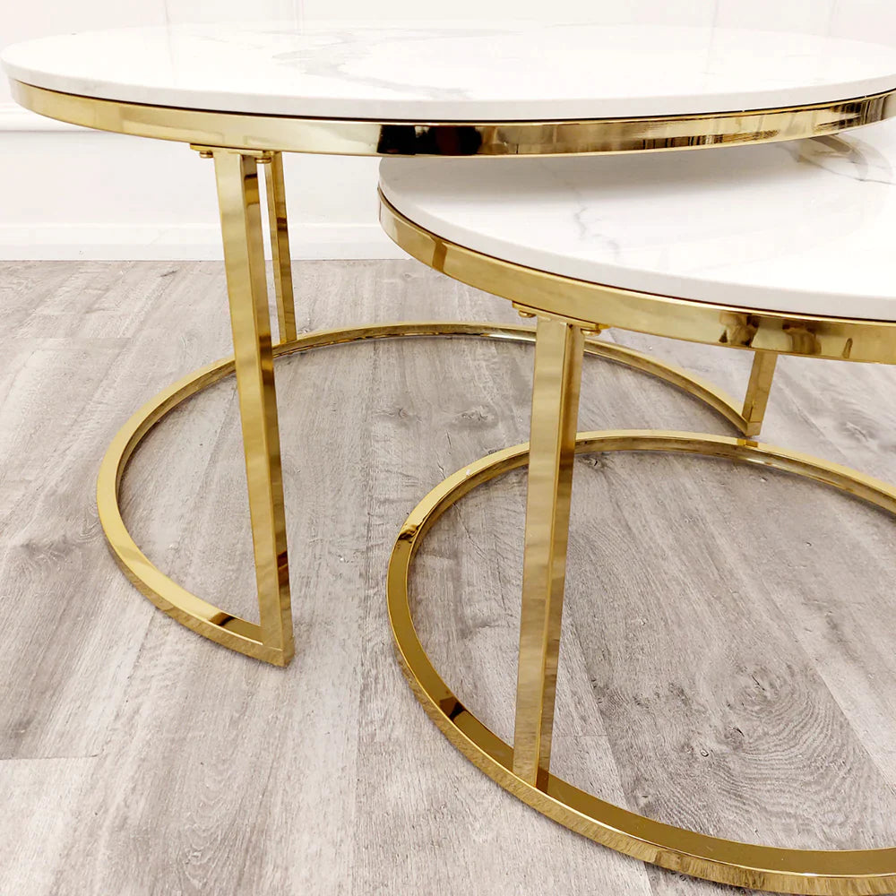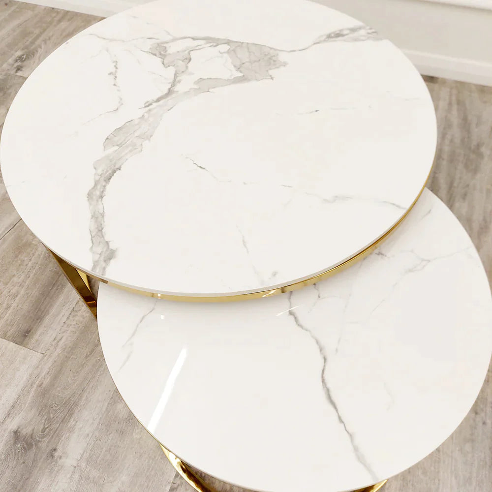 This beautiful 2 piece nest table set features Polar White sintered stone tops placed on simple round gold frames.