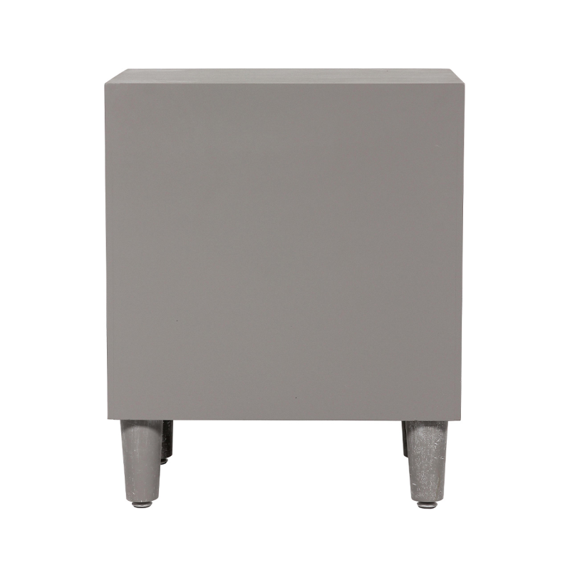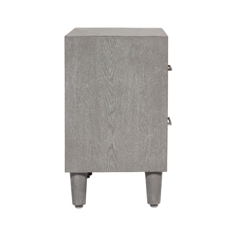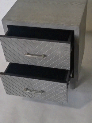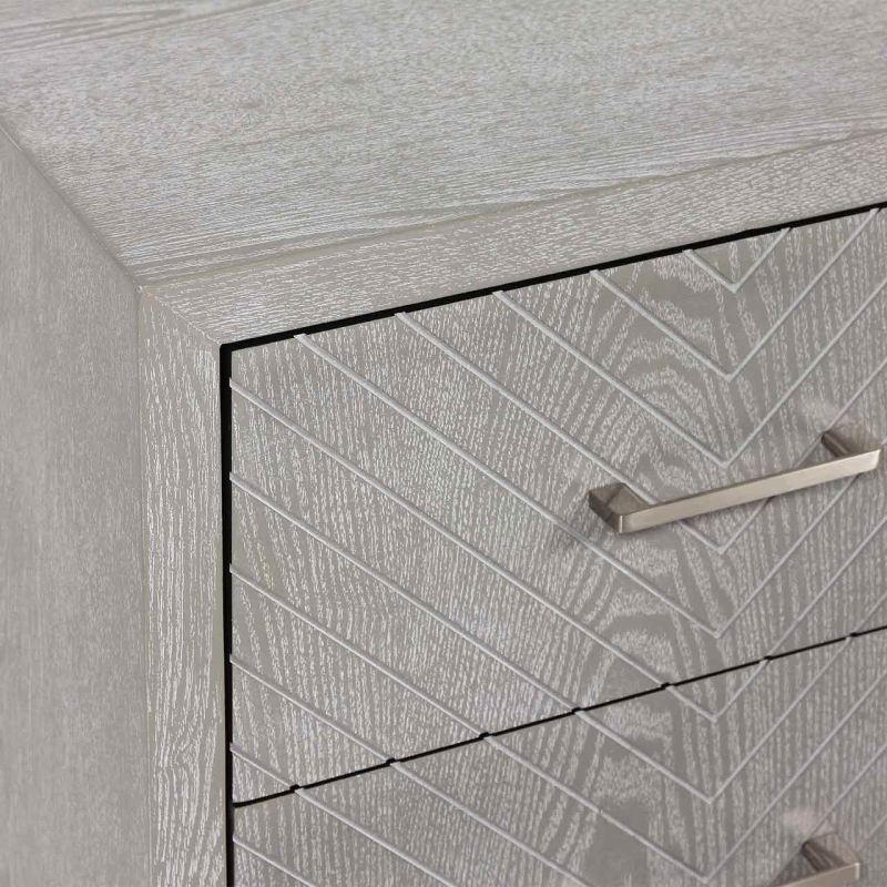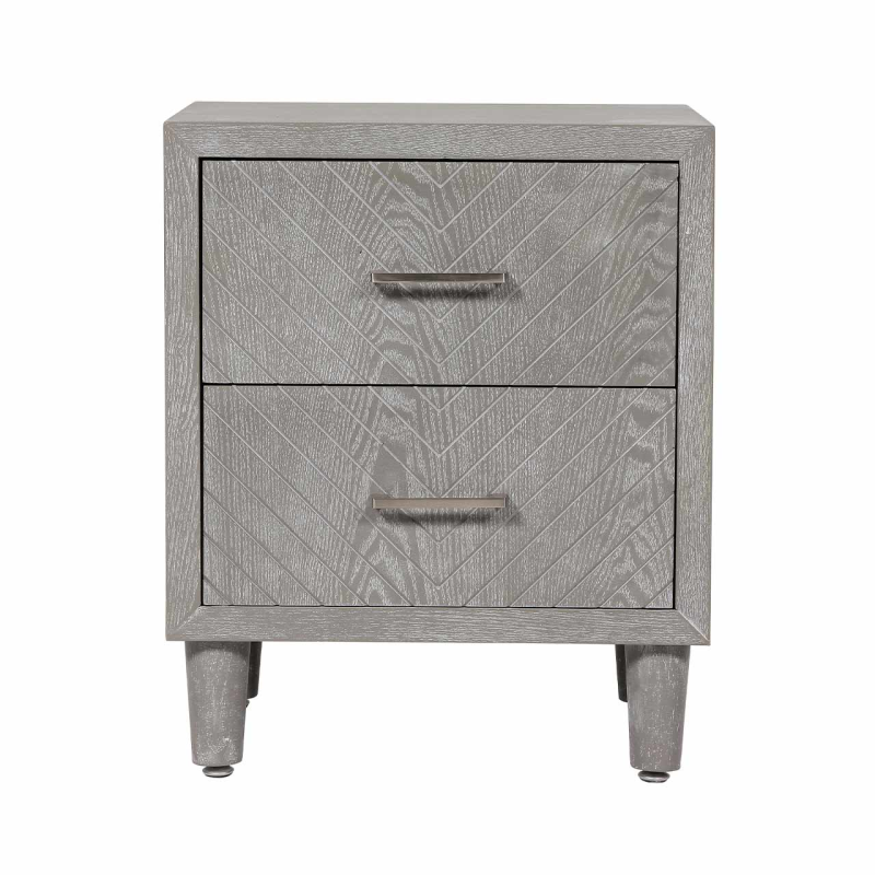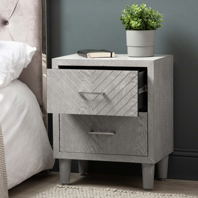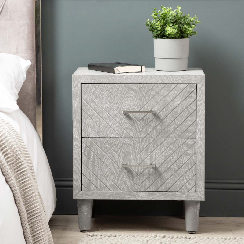 Our simple yet stylish Venus two-drawer bedside is designed to complement any bedroom's decor. The muted grey-washed elm grain finish with chevron detailing, sleek satin steel bar handles on the drawer fronts and elegant turned legs make this both tasteful and functional.
