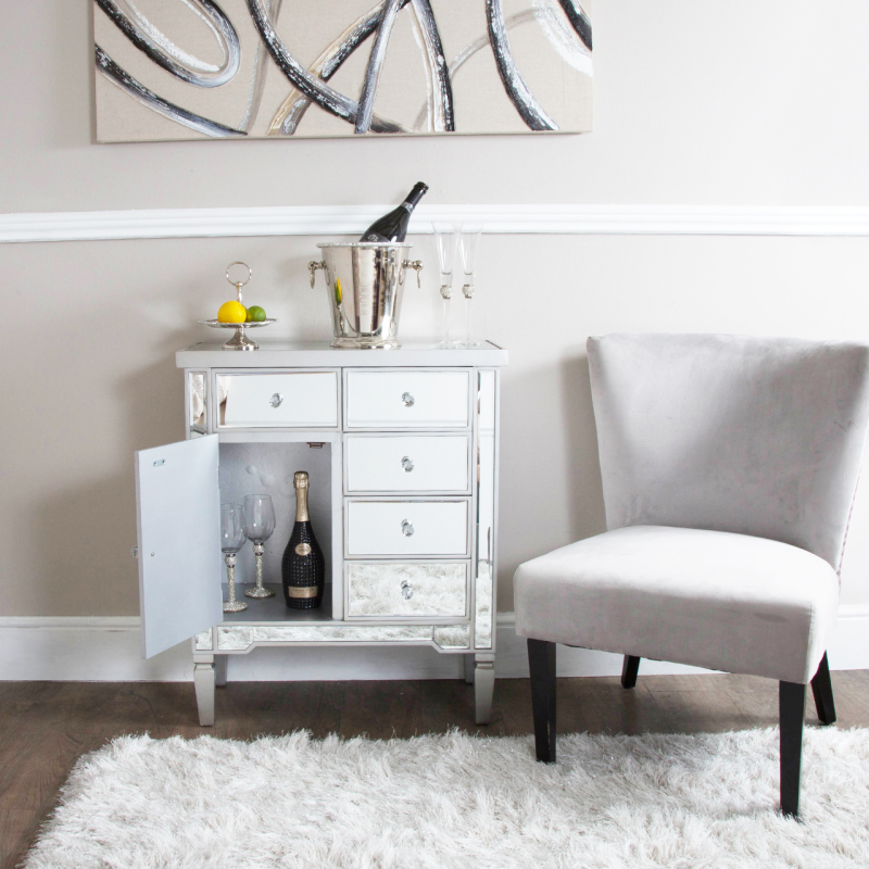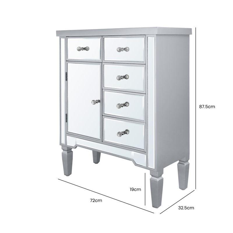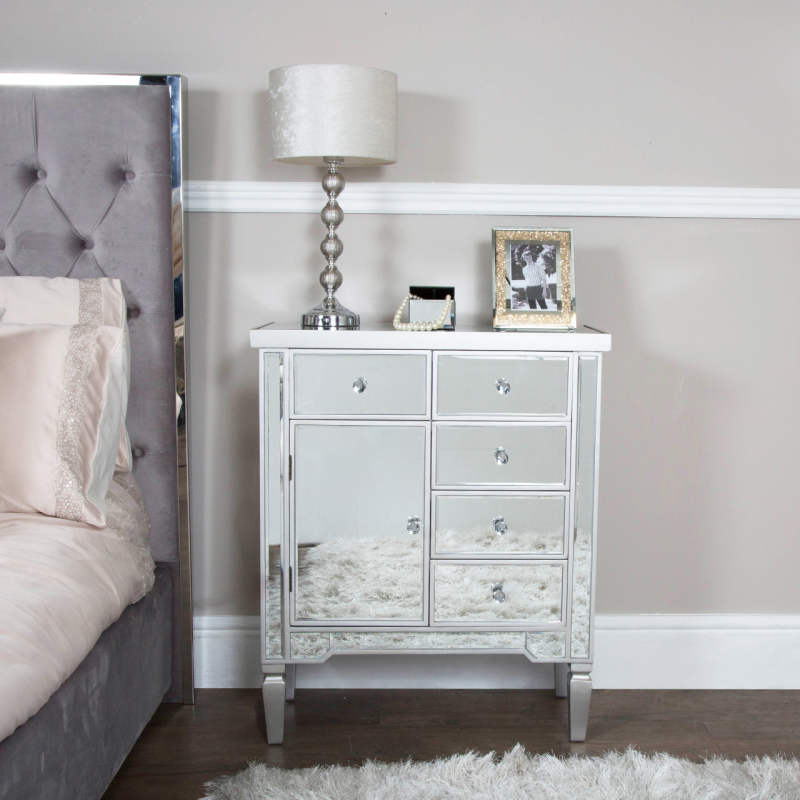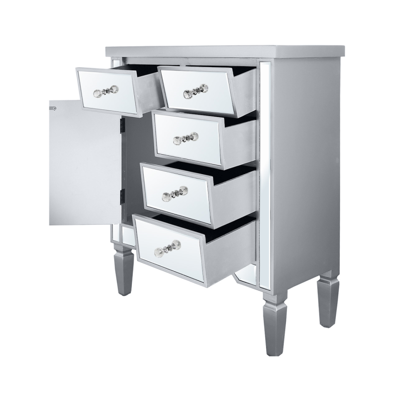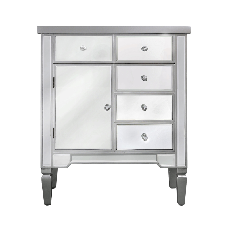 Add this classy silver 5 chest drawer with wood trim that will look great in your bedroom. This wood chest drawer has a mirrored top and wooden legs. This features brand new crystal handles and five drawers and one door for storage purposes that will be t