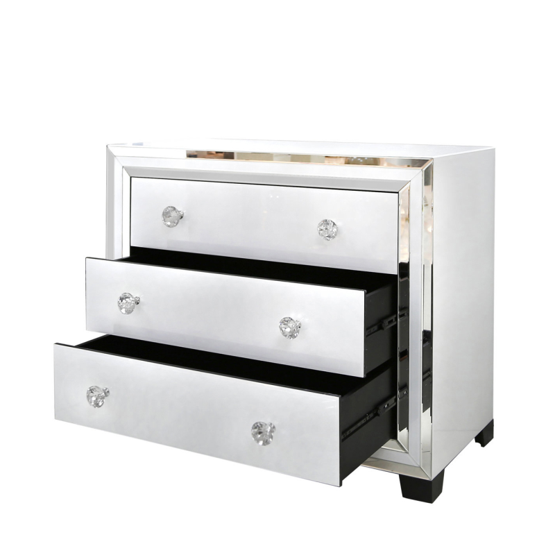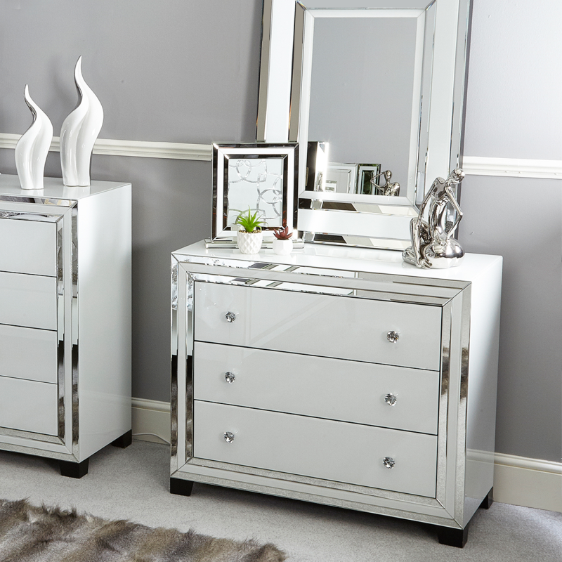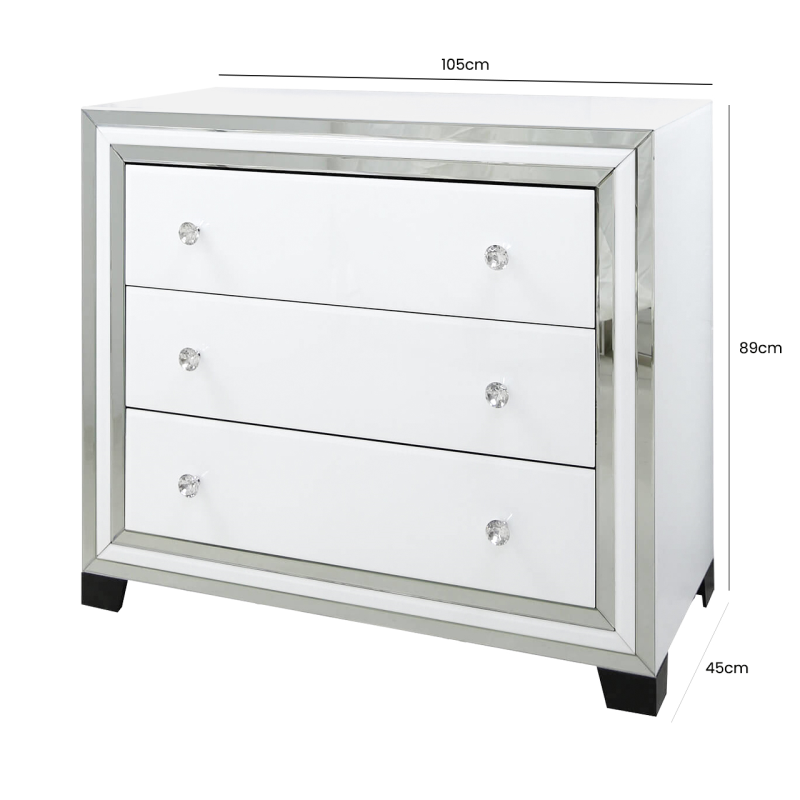 Add a touch of modern glam into any bedroom with the white Manhattan mirror 3 drawer chest. Constructed in wood the cabinet is inlaid with white glass panels that are edged with bevelled clear mirror. For added glamour the cabinet features sparkling crystal handles that are fitted to generously spaced soft closing drawers that glide on metal runners.