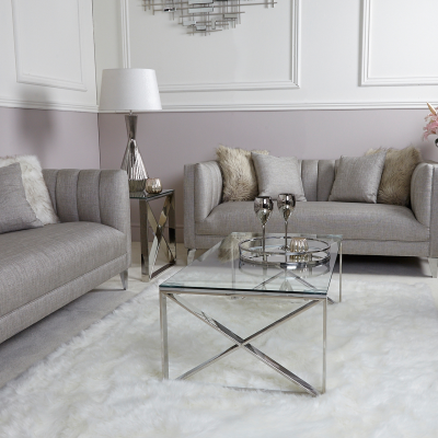 Fill your living space stylishly with this Zeni rectangular clear glass and stainless steel coffee table. This simple, yet elegant, coffee table features a clear glass top and sturdy stainless steel X shaped design on the ends of the base.